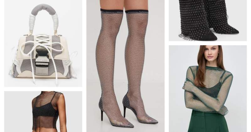 Noutatea cu adevărat surprinzătoare a lui 2024 este faptul că designerii au optat pentru plasă chiar și atunci când vine vorba de încălțăminte și astfel botinele, cizmele, baleriniii și șosetele din plasa care pun piciorul în evidență într-un mod subtil și mai eteric au luat cu asalt moda. De multe ori plasa, mai ales dacă este neagră, este evidențiată de mici detalii de strălucire precum cristale, ștrasuri sau pietre.