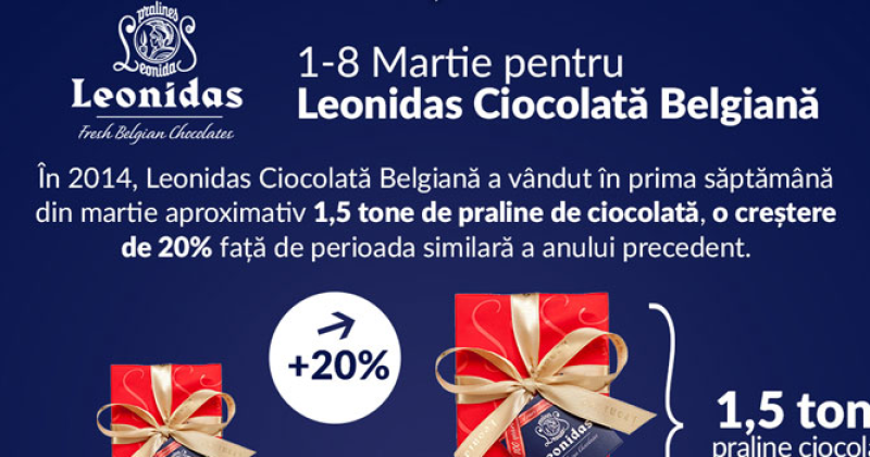Anul trecut, Leonidas Ciocolata Belgiana (www.ciocolatabelgiana.ro) a vandut in prima saptamana din martie aproximativ 1,5 tone de praline de ciocolata, o crestere de 20% fata de perioada similara a anului precedent. Cel mai cautat cadou este asortiment-ul Clasic Ballotin 250g, iar aproximativ 60% dintre cei care cumpara praline de ciocolata pentru a le oferi in aceasta perioada sunt barbati. Leonidas Ciocolata Belgiana este prezent in Romania cu patru ciocolaterii, dintre care doua in Bucuresti (zonele Piata Dorobanti si Calea Victoriei) si cate una in Iasi si Brasov. Planul de extindere in 2015 include lansarea unei ciocolaterii Leonidas Chocolate&Coffee la Cluj Napoca, iar proiectul este programat sa demareze in urmatoarele luni.