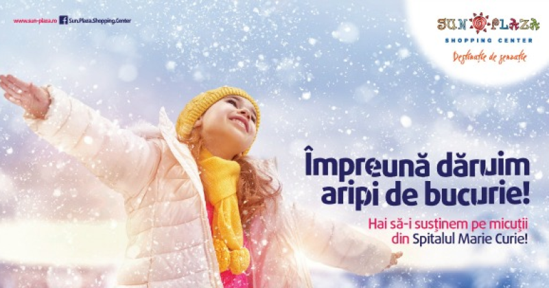 Alaturi de Sun Plaza si Fundatia HOSPICE Casa Sperantei, au daruit aripi de bucurie alte cateva mii de oameni calauziti de dorinta nobila de a aduce zambete si speranta pe chipurile micutilor pacienti. Ca urmarea a acestui parteneriat, in perioada 18 decembrie 2015 – 31 ianuarie 2016, a fost donata suma totala de 25,000 de lei, suma care acopera costul a 425 de vizite de ingrijire la copiii internati in Spitalul Marie Curie din Capitala, efectuate de personalul HOSPICE