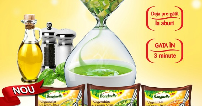 Bonduelle lanseaza pe piata din Romania o inovatie in materie de preparare a supelor crema, o gama de produse create special pentru a oferi consumatorilor o noua experienta culinara, gama de Legume pentru Supe Crema de la Bonduelle. Noile produse incorporeaza procedeul exclusiv Bonduelle, deja pregatite la aburi, datorita caruia legumele isi pastreaza gustul, proprietatile nutritionale si culoarea, aducand totodata si beneficiul prepararii simple si rapide, in numai 3 minute.