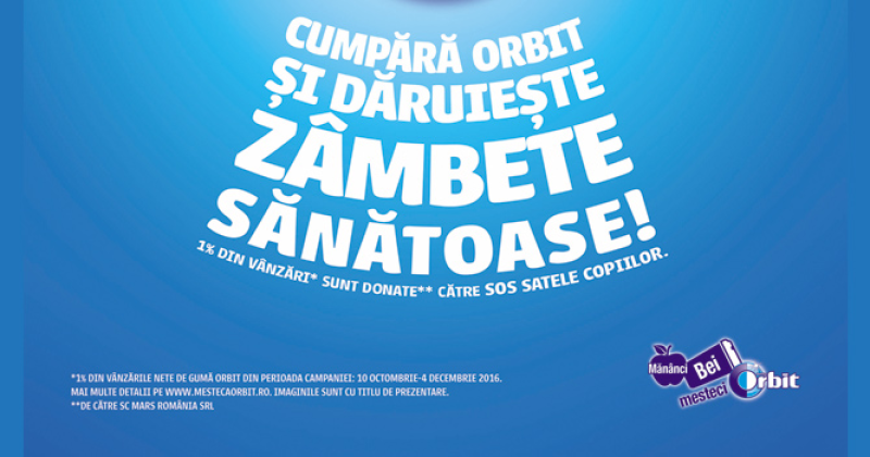 In anul 2016, Orbit isi propune implicarea unui numar mai mare de consumatori in campanie, care sa sprijine igiena dentara a peste 5.000 de copii din Romania. Astfel, toti consumatorii care achizitioneaza produse Orbit in perioada 10 octombrie – 4 decembrie 2016 vor fi implicati in campania ce va darui zambete sanatoase micutilor. Consumatorii vor contribui la strangerea fondurilor necesare pentru dezvoltarea unor programe de educatie in igiena orala destinate copiilor din mediile defavorizate, necesare realizarii actiunilor propuse. Activitatile vor fi demarate in luna aprilie a anului 2017 si vor consta in workshop-uri de igiena orala organizate de SOS Satele Copiilor Romania si sustinute de specialisti in domeniul dentar si cel al asistentei sociale, dar si truse de ingrijire dentara si consultatii stomatologice.