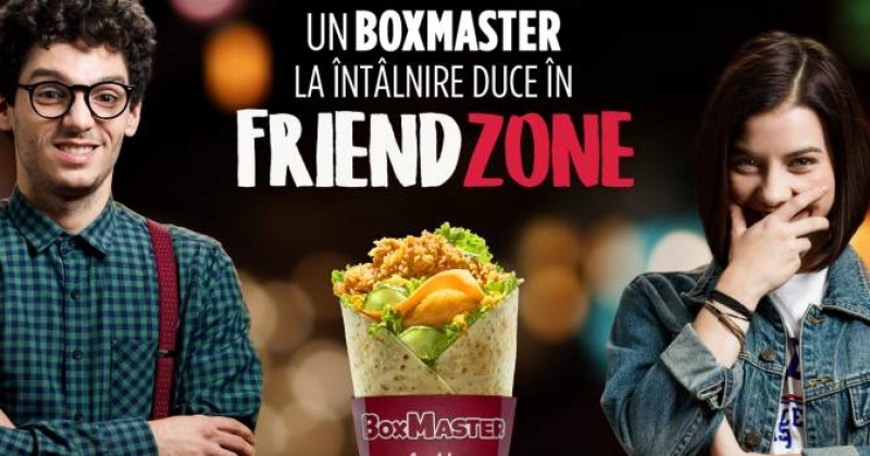 FRIENDZONE este disponibil incepand din 1 noiembrie, pe canalele oficiale de social media ale KFC in Romania si urmeaza filosofia locala a brandului: Fii pe bune, nu perfect! De aceasta data, branded content-ul a fost creat in jurul unui produs lansat odata cu trailerul serialului, ca modalitate inovatoare de promovare pe piata locala. BoxMaster-ul, o combinatie inedita de ingrediente delicioase, devine, practic, testul friendzone-ului: atat de gustos, incat, daca nu te afli in preajma celui sau celei pentru care ai o slabiciune, nimic nu te poate opri sa-l mananci cu cea mai mare pofta...