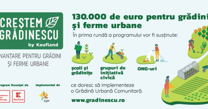 Kaufland Romania lanseaza in premiera platforma de finantare ,,Crestem Gradinescu”, impreuna cu Institutul de Cercetare in Permacultura din Romania, prin care ofera un grant total de 130.000 de euro gradinitelor, scolilor, organizatiilor non-guvernamentale neafiliate politic, grupurilor de initiativa civica, interesate sa dezvolte gradini sau ferme urbane in Romania.