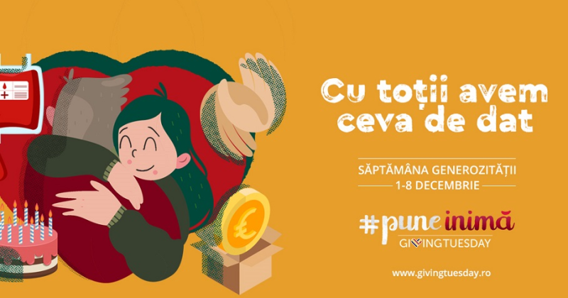 Pentru al patrulea an consecutiv, România se alătură mișcării globale dedicate generozității - GivingTuesday. Prezentă în peste 70 de țări, pe toate continentele planetei, mișcarea încurajează oamenii și organizațiile să ajute la transformarea comunităților din care fac parte. După două zile din noiembrie dedicate cumpărăturilor - Black Friday și Cyber Monday - GivingTuesday face apel la solidaritate și încurajează oamenii să fie generoși și să se implice.