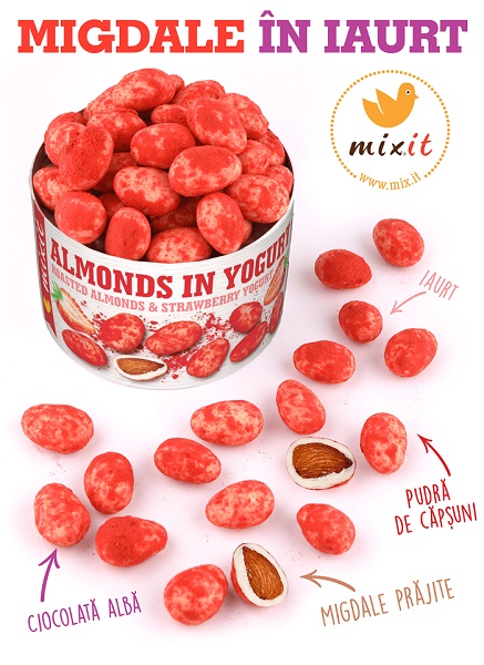 Ingrediente: Migdale în iaurt cu pudră de căpșuni (ciocolată albă cu aromă de iaurt 71 % (zahăr, unt de cacao, lapte praf, iaurt praf 2,5 % (lapte, culturi lactice), regulator de aciditate: acid citric, emulgator: lecitine, extract de vanilie, aromă naturală de iaurt), migdale prăjite 24 %, pudră de căpșuni liofilizate 5 %)
