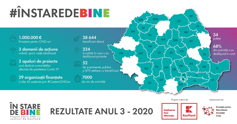 „De patru ani, alături de partenerii de la FDSC, desfășurăm cel mai generos program de finanțare dedicat sectorului non-profit din România: 1 milion de euro pentru proiecte care aduc starea de bine în comunități din toată țara. Pe lângă granturile nerambursabile, în cadrul programului am adăugat componenta de dezvoltare organizațională, iar astăzi ne bucurăm de o rețea puternică de ONG-uri, care colaborează și învață constant. Invităm în continuare organizațiile să aplice cu proiecte îndrăznețe, care demonstrează că implicarea face diferența.”, a afirmat Anna Katharina Scheidereiter, CSR Manager Kaufland România.