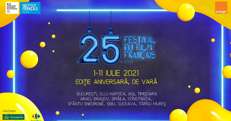 Festivalul Filmului Francez (FFF) din România celebrează 25 de ani de existenţă cu o ediţie aniversară, de vară, care va avea loc între 1 şi 11 iulie, în 12 oraşe din ţară: Bucureşti, Cluj-Napoca, Iaşi, Timişoara, Arad, Brașov, Brăila, Constanța, Sfântu Gheorghe, Sibiu, Suceava şi Târgu Mureş. Proiecţiile vor avea loc în săli de cinema sau spaţii culturale şi în aer liber, cu respectarea normelor sanitare care să garanteze siguranţa spectatorilor, dar şi online, pentru prima dată în istoria festivalului.