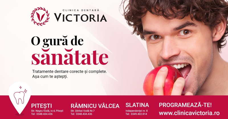 Reteaua de Clinici Dentare Victoria este prezenta in Pitesti, Ramnicu Valcea, Slatina si isi propune sa fie un partener de incredere pentru fiecare pacient, oferind servicii complete si de inalta calitate pentru intreaga ta familie. Pentru echipa din Clinicile Dentare Victoria O gura de sanatate inseamna expertiza, accesibilitate si grija.