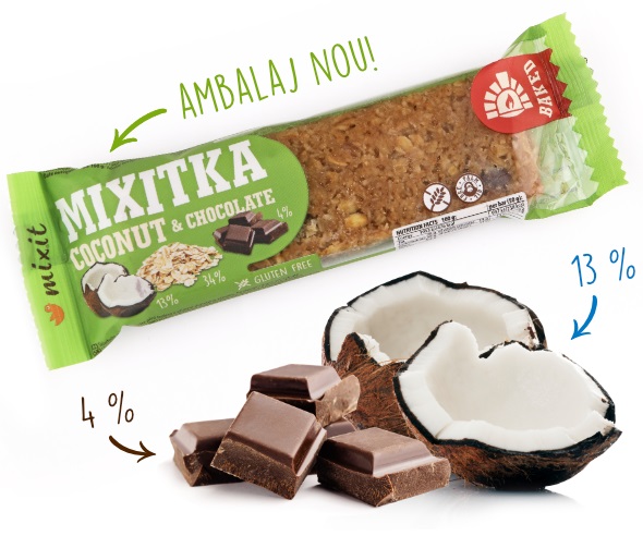 Încearcă, de exemplu, Mixitka - cocos și ciocolată. Este o rețetă nouă, cu o porție generoasă de ciocolată! Bucură-te de batonul cu o bază din fulgi de ovăz fără gluten, cocos parfumat și muuultă ciocolată. Savurează gustul bogat la fiecare înghițitură. Disponibilă în pachete avantajoase 7 + 1 gratuit.