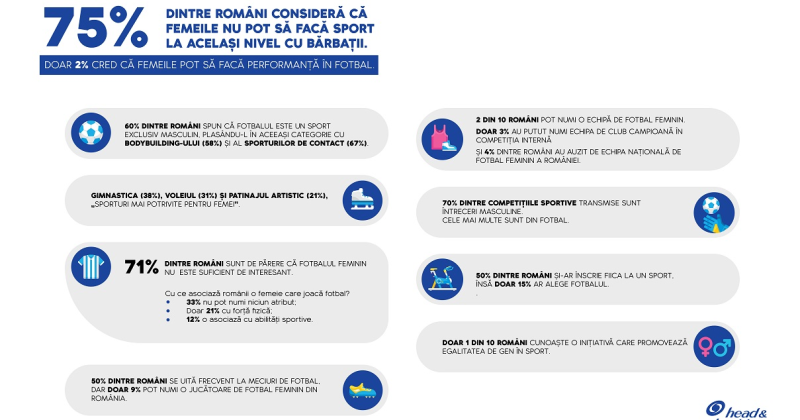 60% dintre români sunt de părere că fotbalul este un sport exclusiv masculin, plasându-l în aceeași categorie cu sporturile de contact și body building-ul. Ei cred, de asemenea, că gimnastica, voleiul și patinajul sunt sporturile în care femeile ar fi mai potrivite, conform unui studiu național realizat de Cult Research. Din aceeași cercetare aflăm și că 75% dintre români consideră că femeile nu pot să facă sport la același nivel cu bărbații și doar 2% dintre aceștia cred că femeile pot să facă performanță în fotbal.