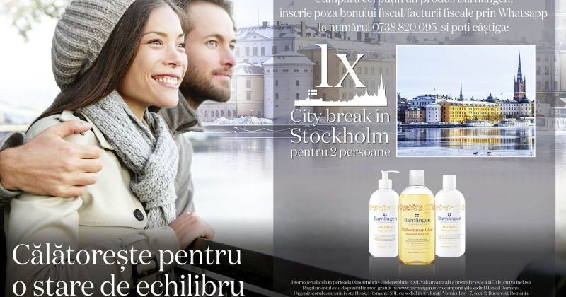 Tot ce trebuie să faci este să cumperi cel puțin un produs Barnӓngen, în perioada 01.11.2021 – 31.12.2021, să trimiți poza bonului fiscal prin Whatsapp la numărul 0738.820.095 și poți câștiga o aventură de vis: un city break în Stockholm, Suedia pentru două persoane. Barnӓngen se ocupă de biletele de avion și cazare pentru 3 nopti cu mic dejun inclus, tu ai nevoie doar de starea de bine în bagaj.