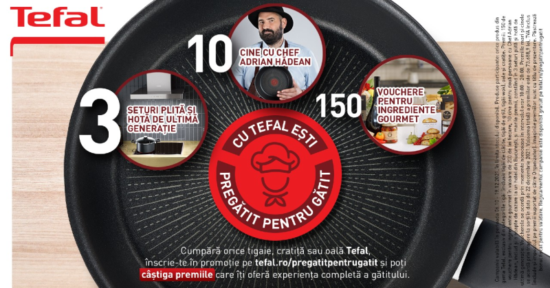 Cumpără orice tigaie, cratiță sau oală Tefal până la 19 decembrie 2021 și înscrie factura/ bonul fiscal pe https://www.tefal.ro/pregatitpentrugatit iar premiile te așteaptă îndată!