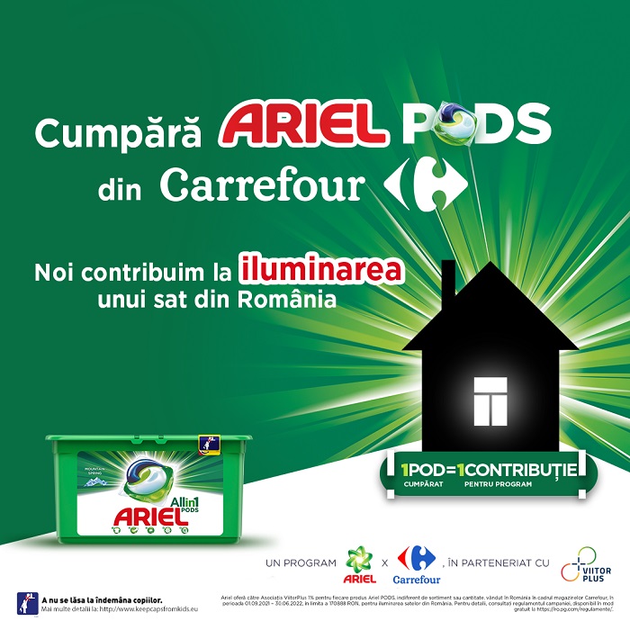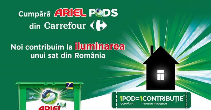 Astfel, până la 30.06.2022, pentru fiecare produs Ariel PODS achiziționat exclusiv din toate magazinele Carrefour din țară, Ariel și Carrefour fac o donație către ViitorPlus pentru iluminarea următoarelor locuințe izolate din România.
