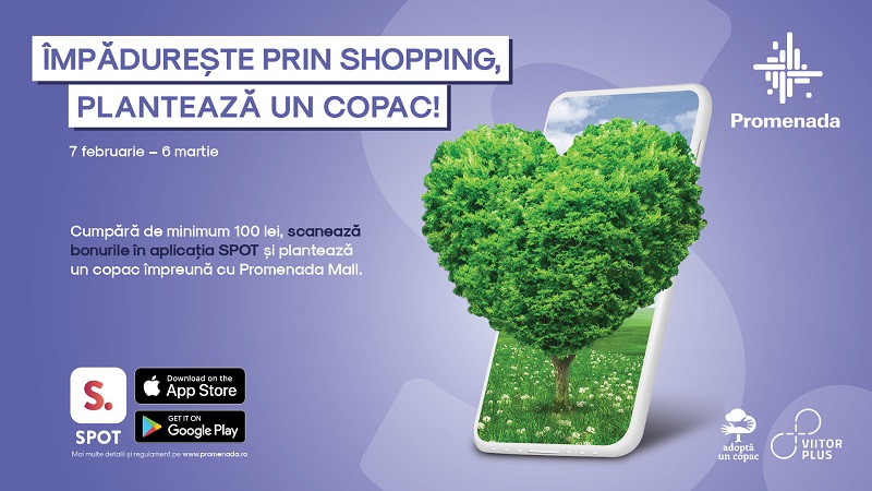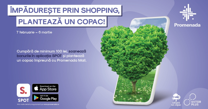 Pentru a contribui la împădurirea terenurilor degradate și evitarea viitoarelor deșertificări în cele mai afectate zone ale țării, Promenada Mall București lansează, în parteneriat cu asociația Viitor Plus, o campanie prin care oricine poate ajuta la plantarea copacilor în sudul țării, în județul Dolj, cel mai afectat de fenomenul deșertificării. Astfel, pentru cumpărături de minimum 100 de lei făcute în Promenada Mall București, clienții pot scana bonul în aplicația mobilă SPOT, iar Promenada va planta și îngriji pe termen lung câte un copac în cadrul programului „Adoptă un Copac!”.