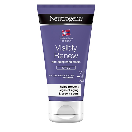 Crema de mâini cu Formula Norvegiană Neutrogena Visibly Renew cu minerale care stimulează colagenul, asigură o hidratare intensă, ajută la refacerea supleței pielii și previne apariția petelor maronii.