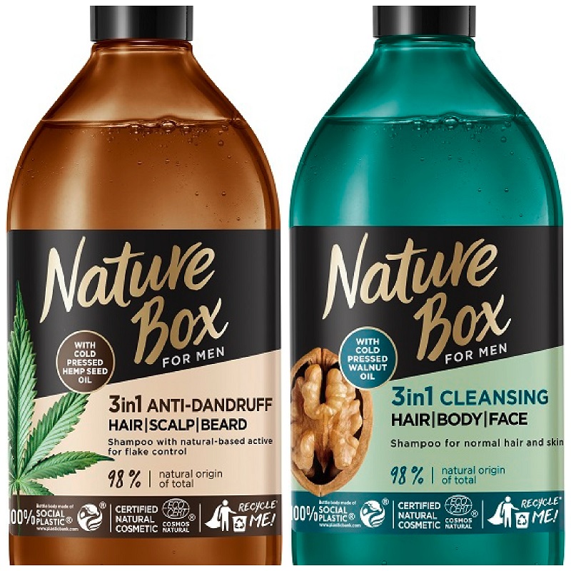 Nature Box lansează pe piață o inovație în materie de îngrijire personală pentru bărbați: gama Nature Box 3în1, ce se bucură de o formulă cu 98% ingrediente de origine naturală, ce oferă cea mai bună îngrijire atât pentru păr, cât și pentru barbă și piele. Ambalajul produsului este realizată 100% din plastic social*, produsul fiind certificat COSMOS**. Notele condimentate din plante sau din nuci răspund celor mai mari nevoi în materie de întreținere personală a bărbaților, precum combaterea mătreții și îngrijirea pielii, a părului sau a bărbii.
