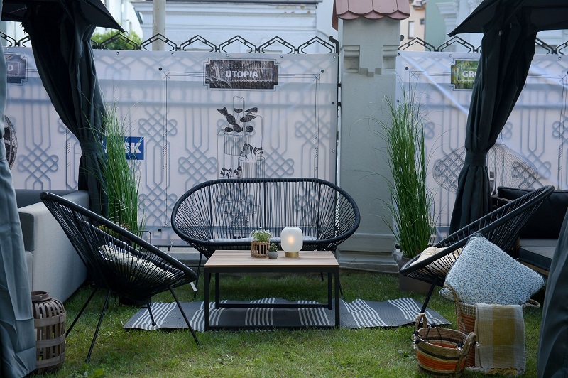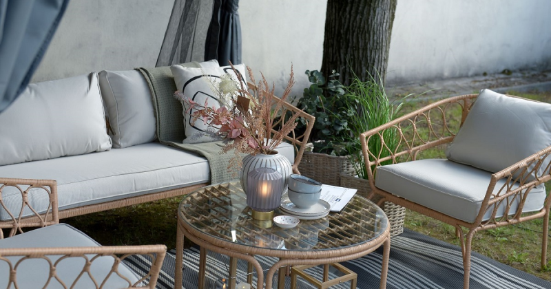 Setul VONGE, de exemplu, are un design minimalist și poate fi lăsat afară chiar dacă plouă pentru perioade scurte de timp. Gama UHRE, care include colțar de terasă și șezlong, este realizată dintr-o țesătură vopsită cu pigmenți protejați UV, care protejează materialul de efectele razelor soarelui, este rezistentă la apă și se usucă rapid. Setul de grădină DAGSVAD, de exemplu, care include masă de grădină și două bănci pentru grădină, este realizat din lemn artificial care nu necesită întreținere.