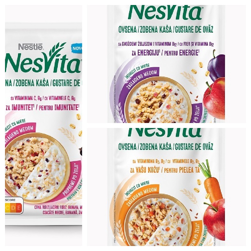 NESVITA® este disponibil în magazine în trei variante: Gustare de ovăz pentru energie, Gustare de ovăz pentru piele sănătoasă, Gustare de ovăz pentru imunitate. Varianta prună-măr cu semințe de in a fost dezvoltată pentru a oferi un plus de energie, varianta morcov-măr conține vitaminele B2 (riboflavină) și B3 (niacină) care contribuie la menținerea sănătății pielii, iar varianta zmeură, coacăze negre și semințe de in cu vitaminele C si B6 a fost creată cu scopul susținerii imunității.