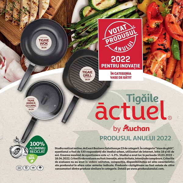 Votat Produsul Anului este un concept internaţional care premiază produsele inovative, activând în prezent în peste 40 de ţări. Studiul a fost realizat online, în perioada 10.03.2022 – 18.04.2022, de Exact Business Solutions pe 23 de categorii. În categoria “Vase de gătit”, eşantionul a fost de 530 respondenți din mediul urban, utilizatori de internet, între 18 şi 65 de ani. Eroarea maximă de eşantionare este +/- 4.3%.