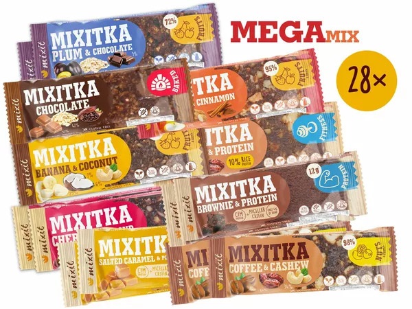 Foarte multe persoane aleg să mănânce o gustare pe zi [1]. Cele 16 tipuri de batoane Mixitka se constituie în tot atâtea idei de gustări pentru birou, picnicuri sau călătorii: de la amestecuri fără gluten de curmale cu smochine, caramel sărat, banană și cocos, arahide și proteine, cocos și ciocolată, afine cafea și caju și până la batoane cu migdale și caju și cele cu ciocolată neagră. Există sortimente fără zahăr adăugat, dar și Mixitka proteică, perfectă pentru cei care caută gustări care aduc sațietate organismului pentru o perioadă mai lungă de timp.