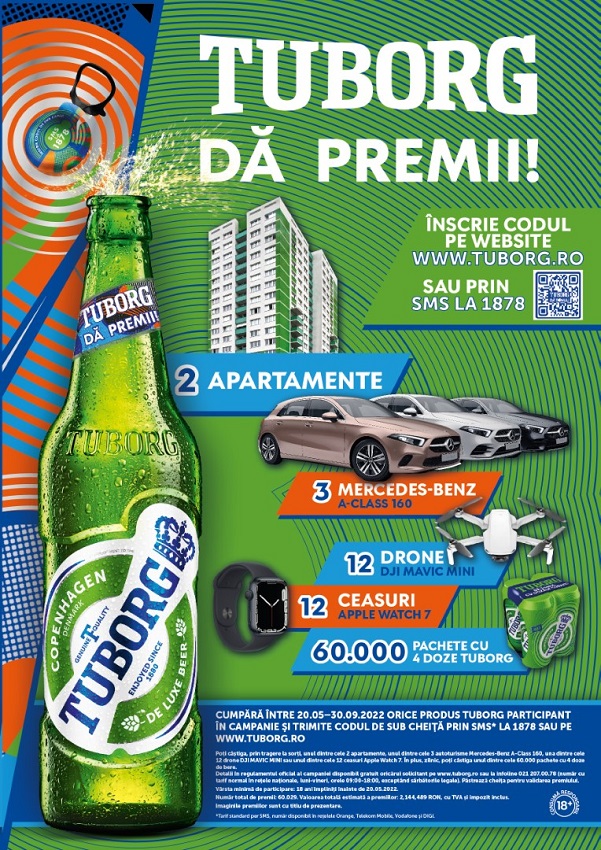 Campania națională Tuborg dă premii vine cu cele mai valoroase premii din segmentul berii în acest sezon: 2 apartamente în București, 3 mașini Mercedes Benz A-Class, 12 drone, 12 ceasuri smart și 60.000 pachete a câte 4 doze de bere Tuborg, totalul premiilor depășind valoarea de 2 milioane de lei!