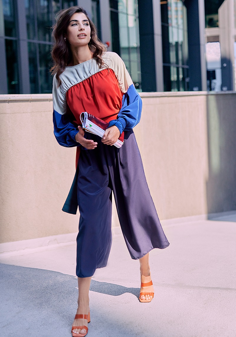 Bluza fluidă cu manșete fundă Michele, cămășile asimetrice cu mânecă clopot Ettore și Martine, topul geometric Nathalie, fusta pantalon Aldo și pantalonii geometrici Matteo sunt piese care nu ar trebui să lipsească din nicio garderobă, în acest sezon și în cele ce urmează.