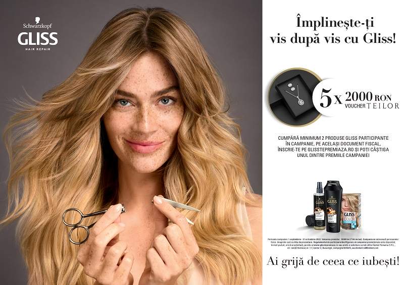 Pentru a intra în campanie, cumpără minimum două produse GLISS* pe același document fiscal, înscrie-te pe glisstepremiaza.ro și poți câștiga unul dintre cele 5 vouchere în valoare de 2000 RON, de care te poți bucura în magazinele de bijuterii Teilor. Un păr sănătos are nevoie să fie accesorizat cu o bijuterie specială pentru a completa un look de poveste. Este momentul tău să strălucești!