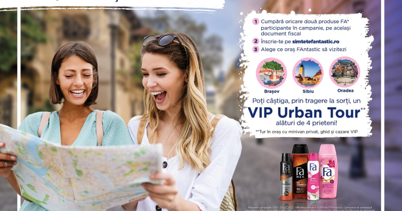Pentru a intra în campanie, cumpără oricare două produse FA* participante în campanie, pe același document fiscal, în perioada 01-30 septembrie 2022, înscrie-te pe simtetefantastic.ro, alege ce oraș fantastic vrei să vizitezi și poți câștiga, prin tragere la sorți, o aventură inedită: un tur în oraș cu un mini-van privat, ghid și cazare VIP.