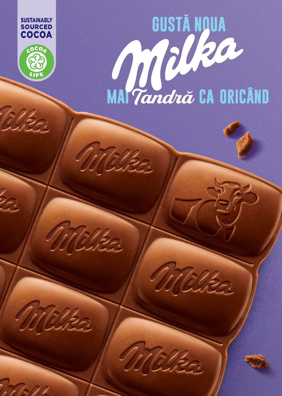 Milka continuă să folosească doar ingrediente de înaltă calitate, atent selecționate, pentru a crea o ciocolată cremoasă pe care fanii Milka o cunosc și o iubesc. Cu cacao obținută prin Cocoa Life, programul de sustenabilitate al Mondelēz International, și cu lapte cremos din Alpi, noua tabletă Milka este cea mai tandră de până acum.