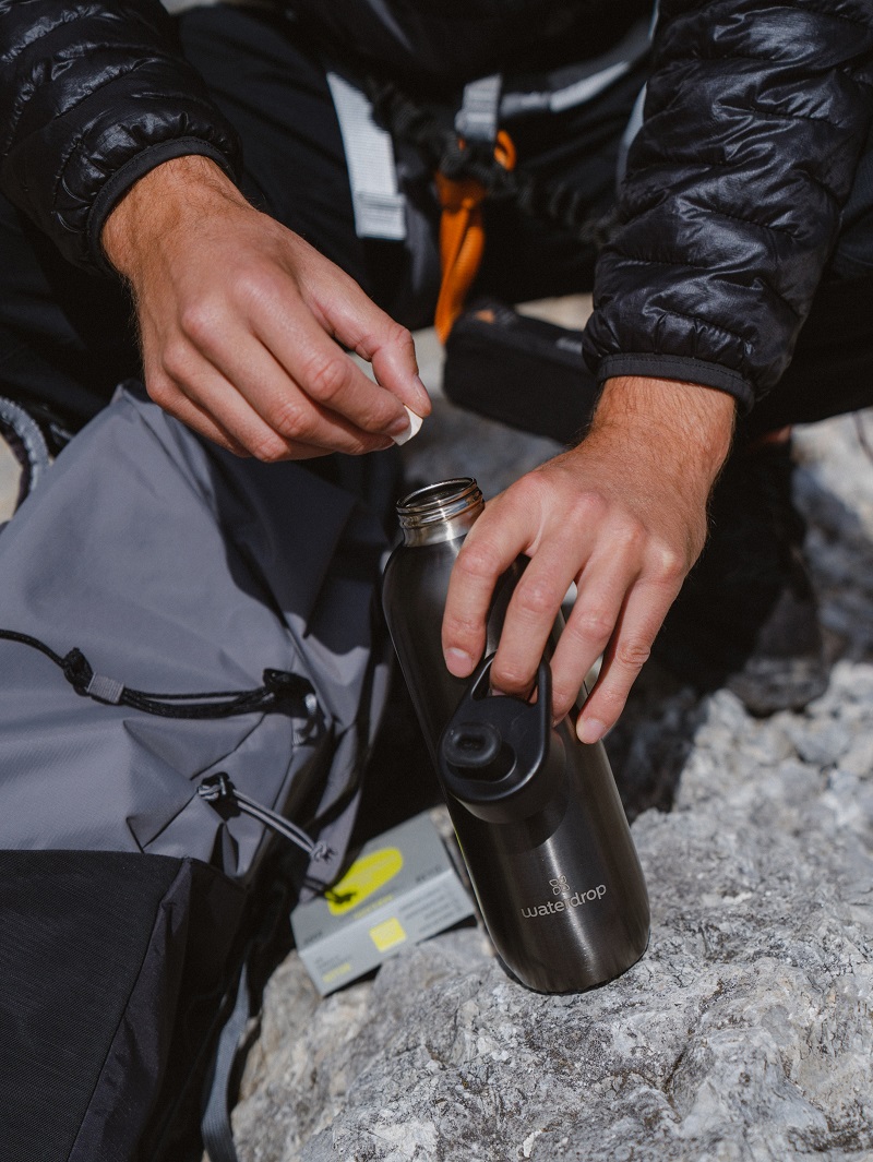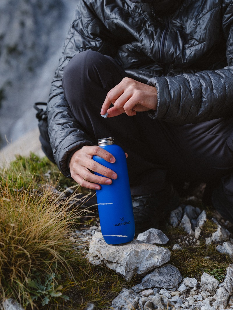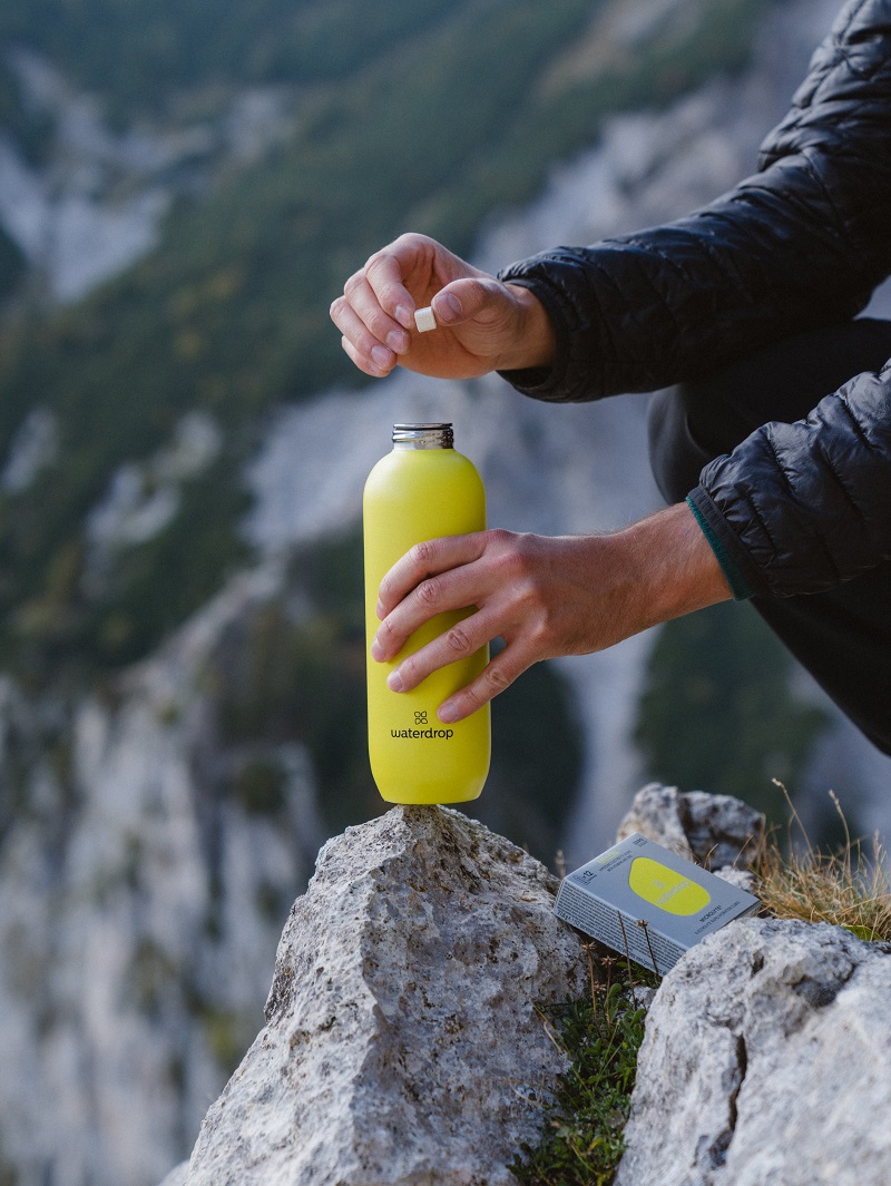 Odată cu lansarea noului sortiment, Waterdrop a creat și un recipient reutilizabil pentru apă, disponibil în trei nuanțe asortate, care să crească buna dispoziție și să impulsioneze hidratare. Confecționate din oțel inoxidabil de înaltă calitate, sticlele au o capacitate de 800 ml, cu o greutate extrem de ușoară de 200g, fiind o modalitate eficientă pentru a monitoriza cantitatea de apă și a oferi o hidratare neîntreruptă.