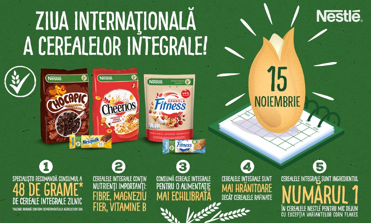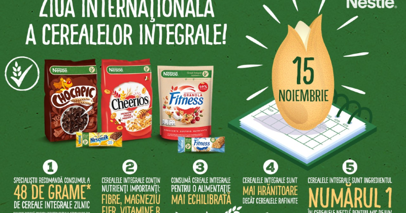 În vederea creșterii consumului de cereale în rândul populației din România, Institutul Național de Sănătate Publică și ROMALIMENTA (Federația patronatelor din industria alimentară) au semnat un protocol de colaborare. Cele două organizații își propun să creeze un context favorabil adoptării unui comportament nutrițional sănătos pentru populația din România, prin identificarea produselor cu un conținut adecvat de cereale integrale, conform cu cerințele europene și mondiale de sănătate. De asemenea, cele două organizații se angajează să susțină activități de informare, educare și comunicare în ceea ce privește prezența produselor cu cereale integrale pe piața românească. Nestlé, membru Romalimenta, susține acest demers și se va implica activ în promovarea acestui obicei alimentar sănătos.