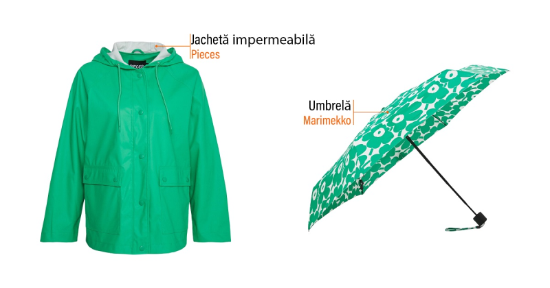 Impermeabilul este ideal când nu vrei să riști. Poți opta oricând pentru jachete în culori și modele care să te facă să te simți bine. Jachetele din țesătură hardshell (rezistentă la intemperii) și umbrelele chic sunt piesele de nelipsit pentru vremea mohorâtă. Unele jachete de ploaie sunt concepute pentru antrenament și au finisaje și detalii cauciucate rezistente la intemperii, în timp ce altele sunt perfecte pentru a fi purtate pe o ploaie slabă. Pe lângă jachetă, alege o umbrelă care să se potrivească stilului tău și pe care să o porți în geantă cu tine mereu.