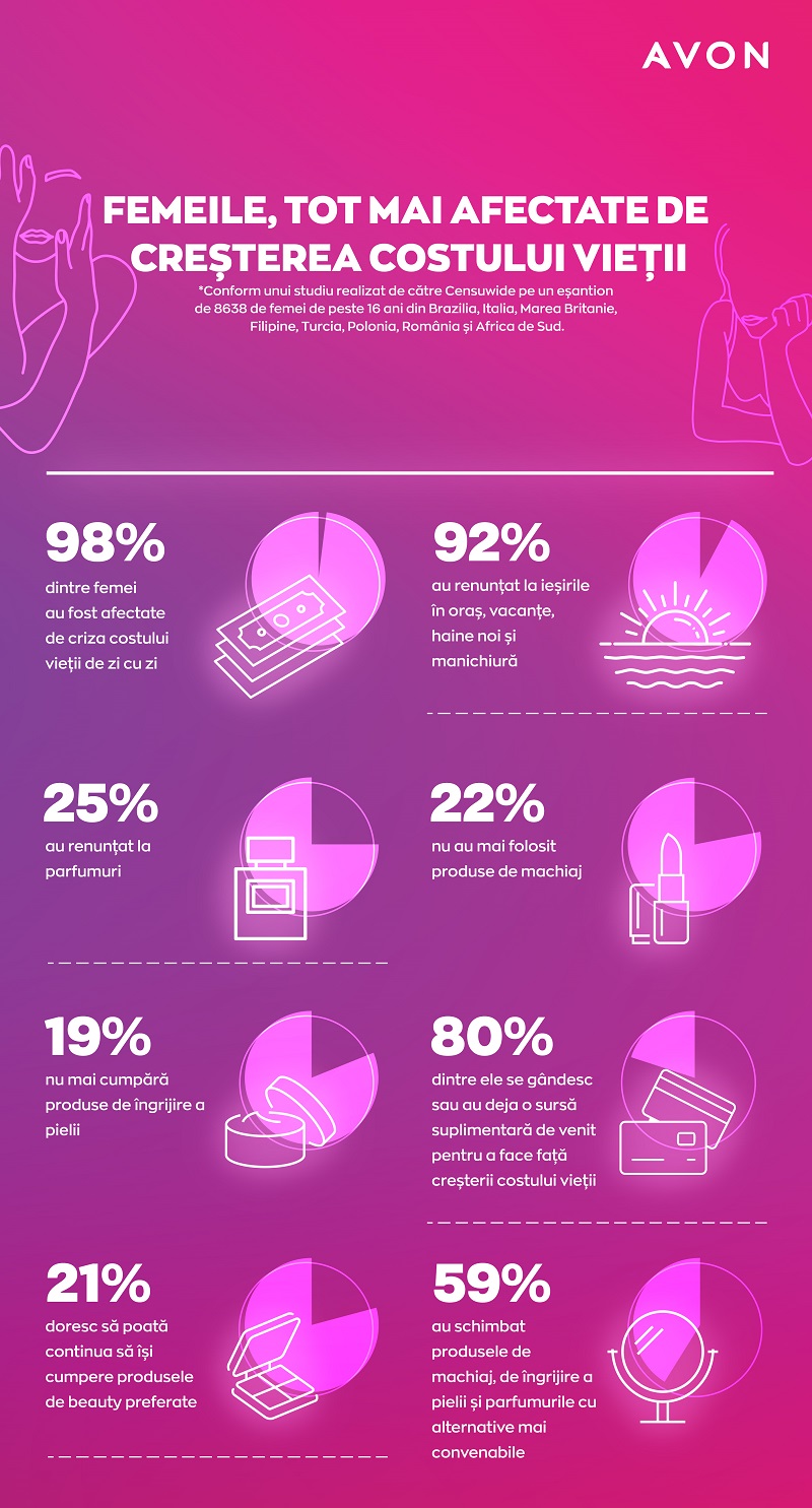 Un studiu realizat de AVON la nivel global[1], inclusiv pe România, arată că un procent uriaș de 98% dintre femei a fost afectat de criza costului vieții. Mai mult de jumătate dintre respondente sunt neliniștite cu privire la viitor (57%), iar peste o treime dintre ele se simt fără control în ceea ce privește finanțele (35%). De asemenea, 34% dintre femei consideră că nu pot oferi suficient sprijin material familiei.