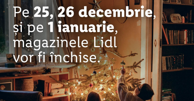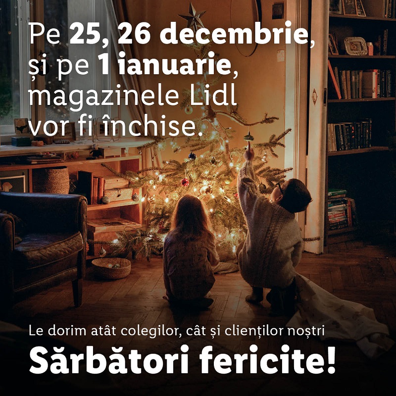 În perioada 19 – 23 decembrie și 27 – 30 decembrie 2022, activitatea magazinelor Lidl se va desfășura conform programului 07:00 – 22:00. În zilele de 24 decembrie și 31 decembrie 2022, clienții își vor putea face cumpărăturile în magazinele Lidl în intervalul orar 07:00 – 18:00. Pe 25 – 26 decembrie 2022 și 1 ianuarie 2023 magazinele Lidl vor fi închise. În data de 2 ianuarie 2023, orarul de funcționare al magazinelor Lidl va fi între 09:00 – 17:00, iar începând cu 3 ianuarie 2023 magazinele Lidl vor reveni la programul normal de funcționare, între 07:30 și 21:00.