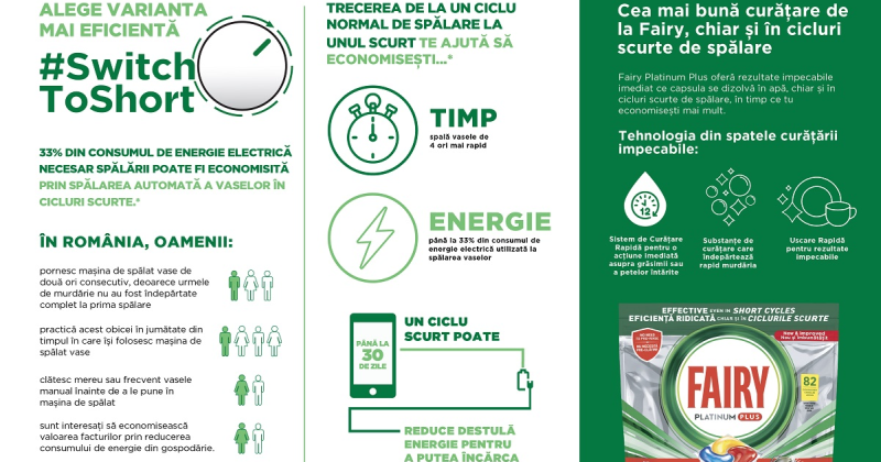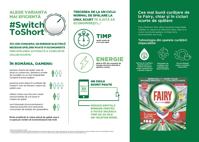 Astfel, punând nevoile consumatorilor pe primul plan, Fairy lansează noile capsule Platinum Plus care acționează eficient chiar și în ciclurile scurte de spălare și reușește să curețe vasele murdare mai rapid, lucru care îi ajută pe români să reducă cu până la 33% din consumul de energie electrică necesar spălării automate a vaselor.