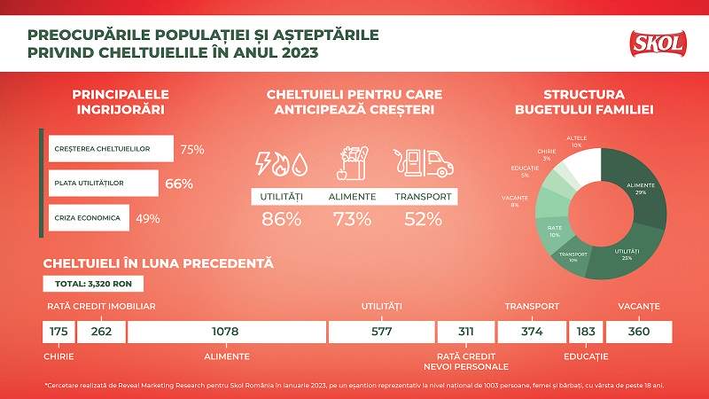 Conform studiului Omnibus* realizat de Reveal Marketing Research pentru marca Skol în luna ianuarie 2023, top 3 al categoriilor de cheltuieli pentru care cei mai mulți români anticipează creșteri în acest an sunt utilitățile (86%), alimentele (73%) și combustibilul (52%). Conform cercetării, factura la utilități (lumina, gaze, apă, întreținere) are o pondere estimată de 25% din totalul cheltuielilor unei familii, cu o valoare medie de 577 lei.