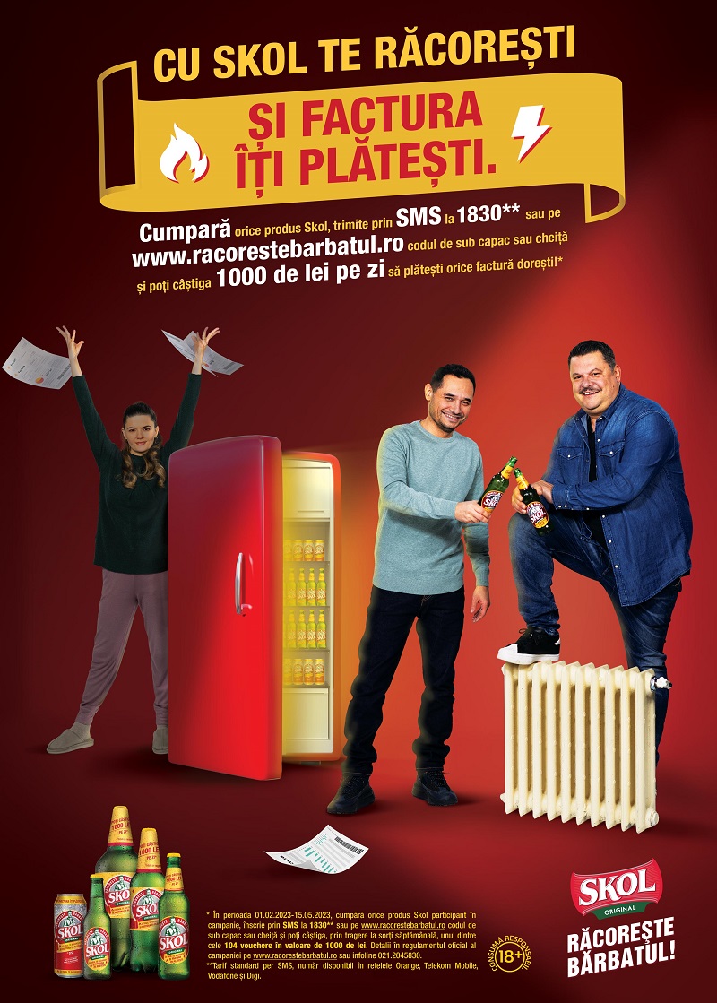 Prezent de 25 de ani pe piața românească, Skol este un brand apropiat de români, ce a dezvoltat de-a lungul vremii numeroase campanii relevante. Începând din anul 2021, Mihai Bobonete și Mihai Rait au devenit ambasadori de brand și actorii principali în execuțiile sub sloganul „Răcorește Bărbatul”. Promoția „Cu Skol te răcorești și factura îți plătești” marchează continuarea colaborării cu cei doi ambasadori prin realizarea unor noi materiale pline de umor, pe care le vom regăsi în campania media atât la TV, cât și online.