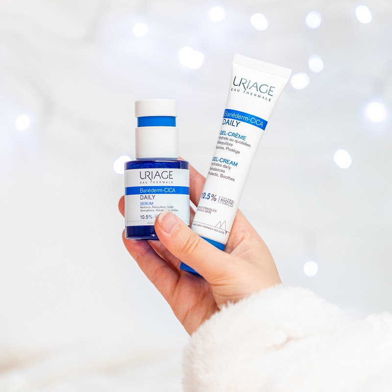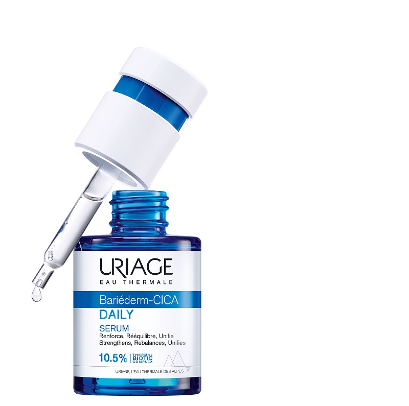 Gama Bariéderm-Cica Daily (recomandată îngrijirii și reparării pielii) conține un complex unic 10.5% THERMAL-BIOTIC COMPLEX - compus din Apă Termală Uriage (o apă unică în lume, având o mineralitate bogată de 11g/L, care reface bariera cutanată prin reechilibrarea microbiomului și ajută la diminuarea pierderilor de apă la nivelul epidermei) și prebiotice (reechilibrează, protejează și refac microbiomul). Serul Bariéderm-Cica Daily fortifică, protejează și regenerează, în fiecare zi, pielea iritată și sensibilă, favorizând reducerea ridurilor.