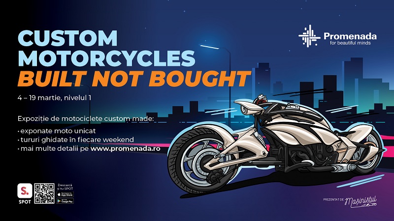 Pentru pasionații de motoare, stil și adrenalină, Promenada Mall găzduiește o selecție impresionantă care cuprinde unele dintre cele mai spectaculoase motociclete custom din țară, în perioada 4-19 martie, la nivelul 1. Expoziția prezintă modele unice, transformate de ateliere locale în adevărate opere de artă. Vizitatorii vor avea ocazia de a descoperi stilurile Chopper, Bobber, Cafe Racer, Scrambler, Bagger, Speed Tracker, Drag, Streetfighter, Supermoto, Rat Bike, dar și multe alte surprize.