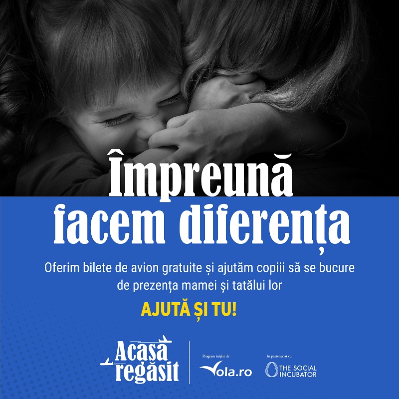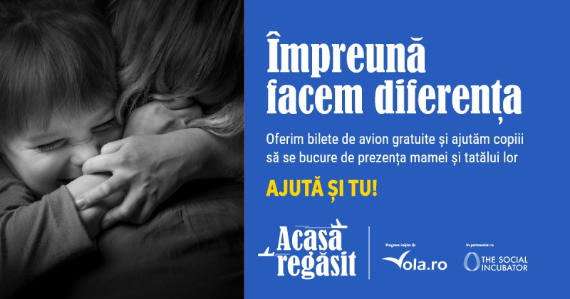 Vola.ro și Asociația The Social Incubator continuă programul „Acasă Regăsit”, prin care își doresc să readucă împreună părinții plecați la muncă în străinătate și copiii rămași în țară, oferindu-le bilete de avion gratuite. Datorită succesului înregistrat de programul pilot, desfășurat anul trecut, organizatorii și-au propus să ajute un număr mai mare de beneficiari. Dorința de implicare din partea comunității a deschis o nouă etapă a campaniei, aceea în care se strâng fonduri pentru a reuni cât mai multe familii separate de migrația economică.
