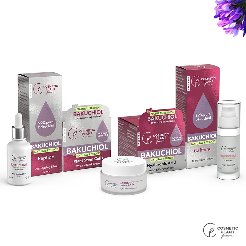 Gama BAKUCHIOL este formată din Anti-Ageing Elixir Serum cu Bakuchiol și peptide, Magic Eye Cream cu Bakuchiol și cafeină, Wrinkle Repair Cream cu Bakuchiol și celule stem din plante și Hydra & Firming Cream cu Bakuchiol și acid hialuronic.
