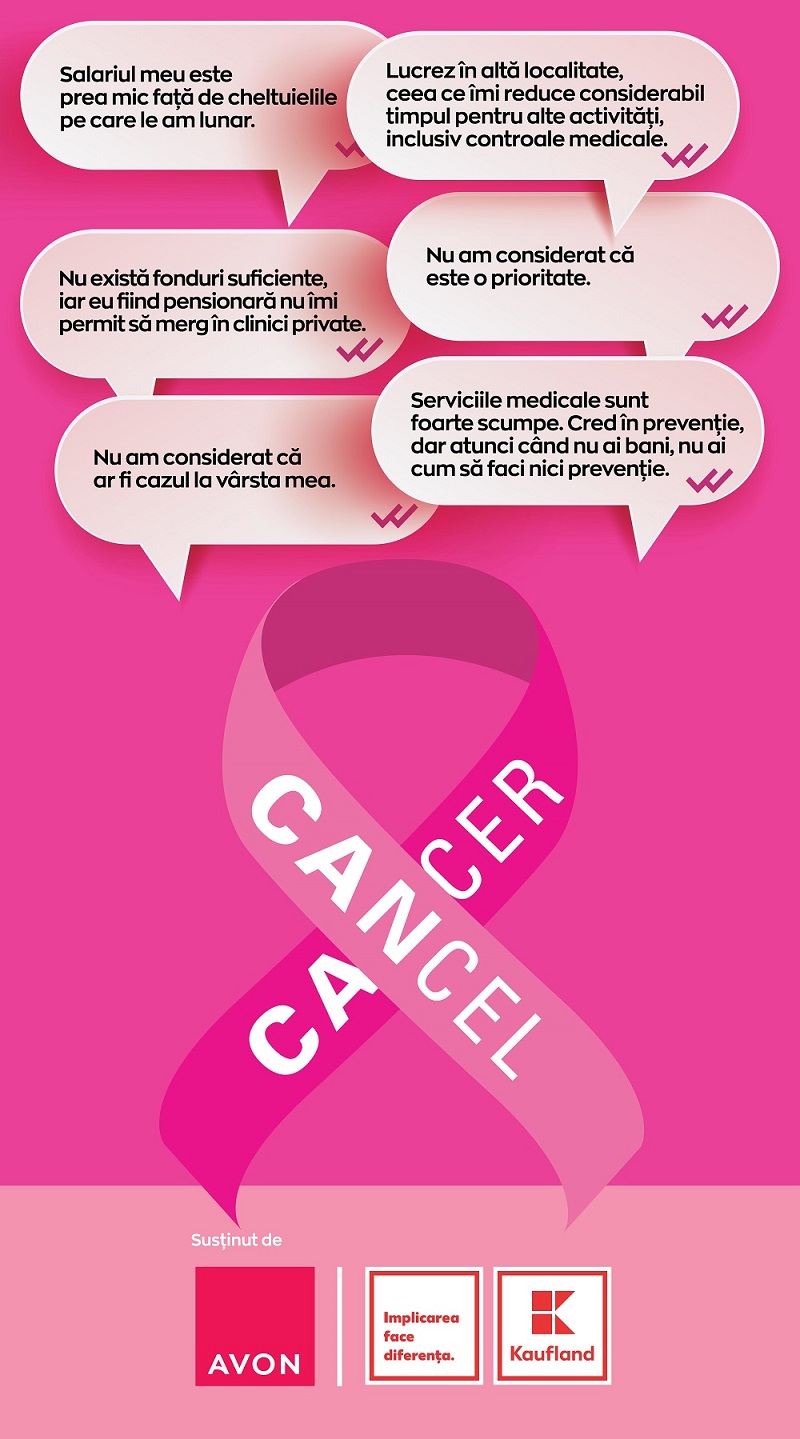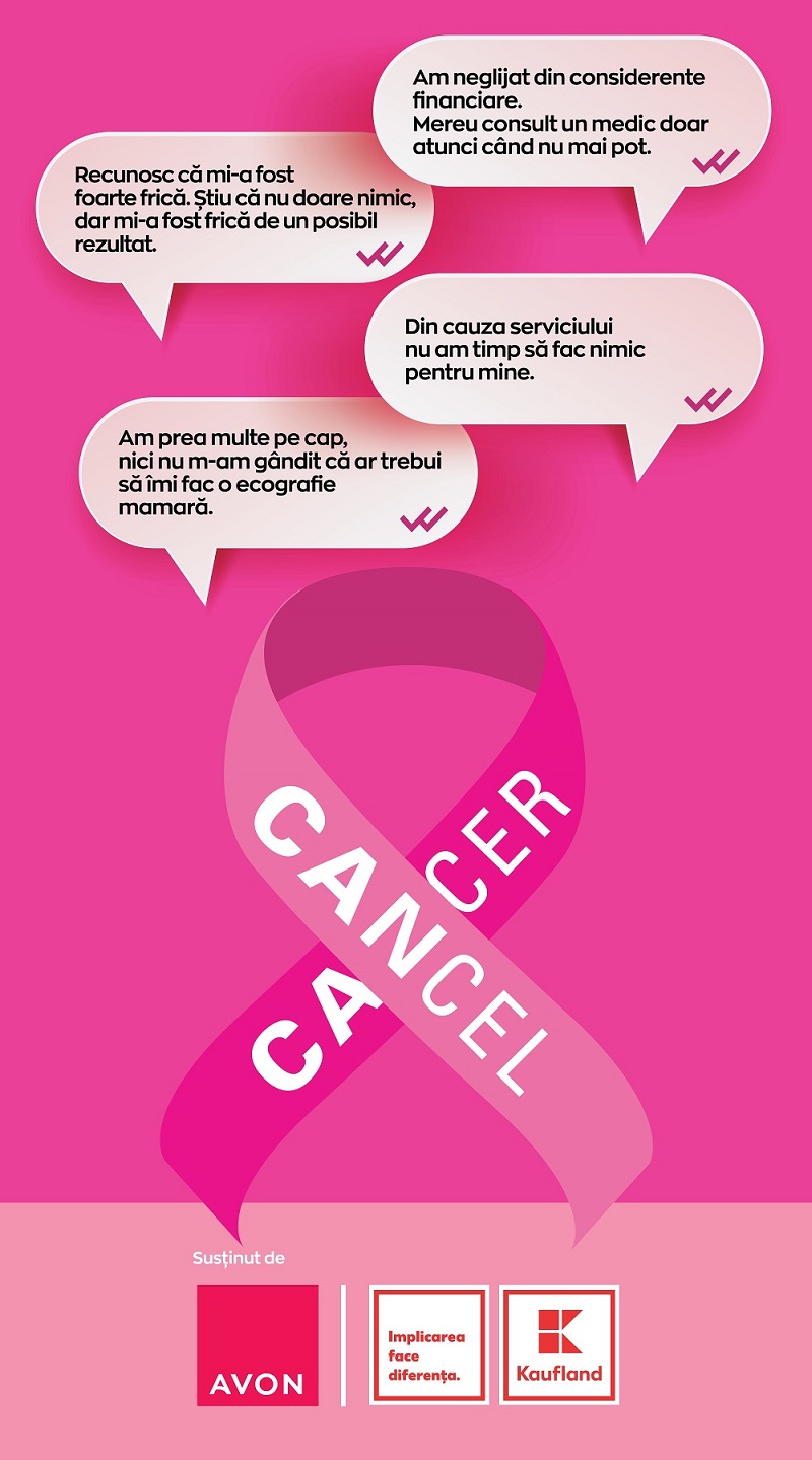 Dintotdeauna am considerat că implicarea face diferența. Acesta este motivul pentru care, de șase ani, Avon & Kaufland România pun în mișcare caravana Cancel Cancer. În metroul roz găsim peste 2500 de scuze pentru care femeile au amânat controlul mamar. Scuze care au fost adunate în caravana socială. Ele reprezintă, zicem, noi, cel mai bun imbold pentru a convinge femeile să planifice cât mai curand ecografia mamară.