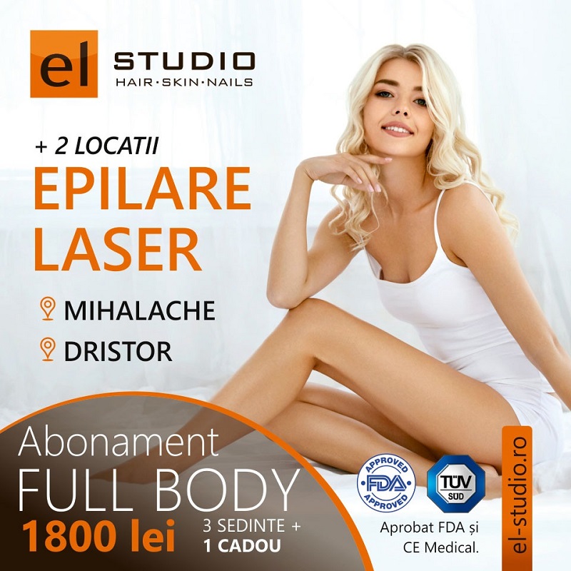 În această perioadă beneficiezi de abonamentul laser Full Body cu 3 ședințe + 1 CADOU la prețul de 1800 lei. Serviciul de epilare cu laser îl găsești doar în saloanele el Studio din Titulescu, Unirii, Tei, Floreasca, Lujerului, Mihalache și Dristor.