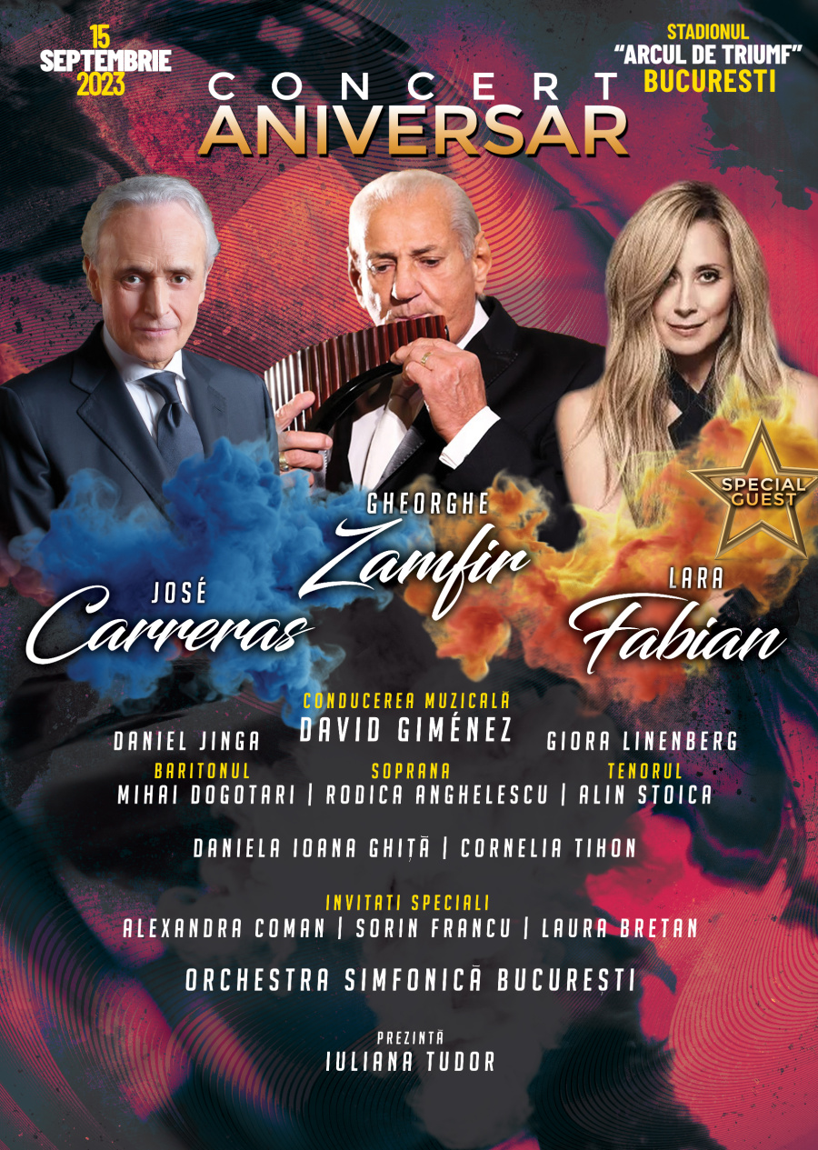 În cadrul concertului aniversar, Gheorghe Zamfir, Lara Fabian și Jose Carreras vor bucura sufletele celor prezenți cu show-uri consacrate. Seara va fi plină de surprize și de invitați speciali ce vor completa tabloul artistic. Orchestra Simfonica București, sub bagheta alternativă a dirijorilor David Gimenez, Daniel Jinga și Giora Linenberg, va asigura acompaniamentul soliștilor. Laura Bretan, copilul minune care acum 7 ani uimea lumea cu performanța sa din finala America's Got Talent, va cuceri acum cu maturitatea interpretativă. Vor contribui de asemenea la o seară memorabilă și soprana internațională Alexandra Coman, soprana Rodica Anghelescu, tenorul Alin Stoica, precum și baritonul Mihai Dogotari, alături de naistele Daniela Ioana Ghiță și Cornelia Tihon.