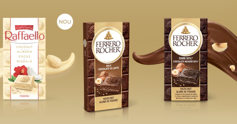Tabletele de ciocolată Ferrero Rocher sunt inspirate din specialitățile emblematice Ferrero Rocher, sunt realizate cu bucăți crocante de alune de pădure, ciocolată delicioasă și umpluturi cremoase rafinate combinate în straturi distincte, în timp ce tableta de ciocolată Raffaello aduce în prim plan aroma exotică a migdalelor și a fulgilor de cocos.