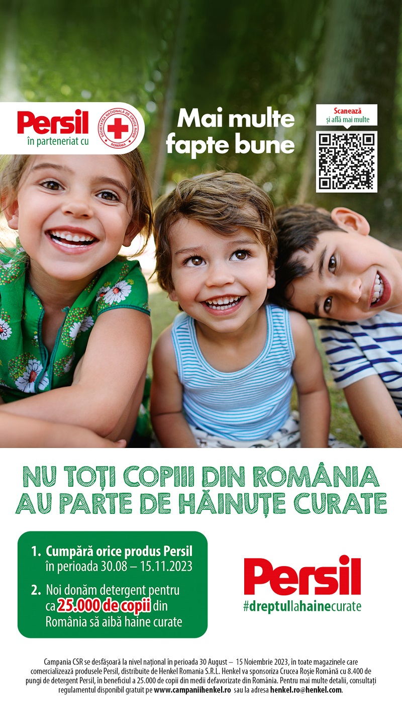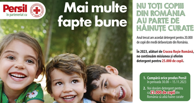 În acest context, anul acesta, Persil continuă campaniei ”Mai multe fapte bune”, derulată în parteneriat cu Crucea Roșie Română, prin care peste 8.400 de produse Persil vor fi donate în beneficiul a 25.000 de copii din medii defavorizate din România (din toate județele țării și din centrele de zi E.G.A.L). În 2022, brandul a lansat parteneriatul cu Crucea Roșie România și a donat detergent pentru 20.000 de copii din familii defavorizate, asigurând astfel accesul copiilor la haine curate.