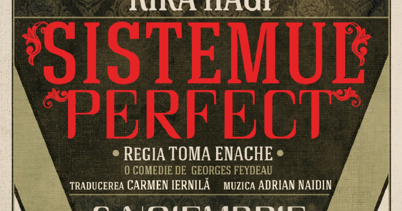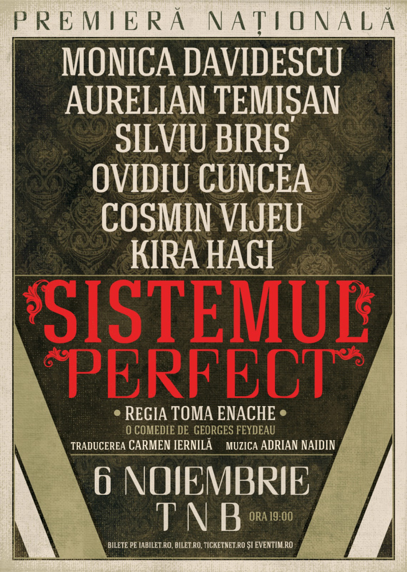 Piesa de teatru „Sistemul Perfect” va avea premiera națională pe data de 6 noiembrie, ora 19:00 la Teatrul Național din București. Bilete pe: iabilet.ro, bilet.ro, ticketnet.ro și la casa de bilete a Teatrului Național ( TNB).