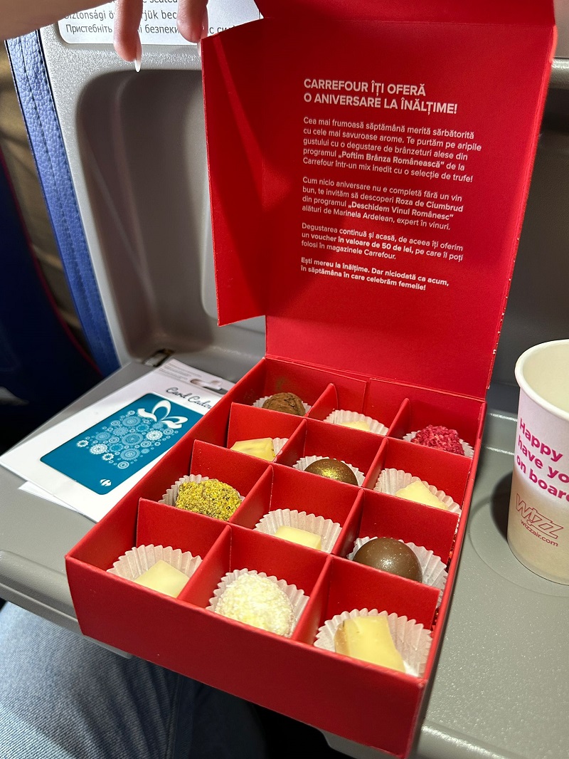 Carrefour continuă promovarea produselor românești cu ocazia unor aniversări speciale, de data aceasta pentru cel mai nou program al său, Poftim Brânza Românească. După ce în 2023, de 1 Decembrie a deschis vinul românesc într-un zbor Treviso/Veneția – București cu o degustare dedicată celor aflați în călătorie de Ziua Națională, în 2024 tradiția a continuat, de data aceasta în săptămâna în care celebrăm femeile. Pasagerii aflați în zborul Wizz Air au fost surprinși cu o degustare de brânzeturi maturate românești, în pairing cu trufe de ciocolată, iar la aterizarea în București le-au fost oferite două vinuri românești special alese din programul Deschidem Vinul Românesc.