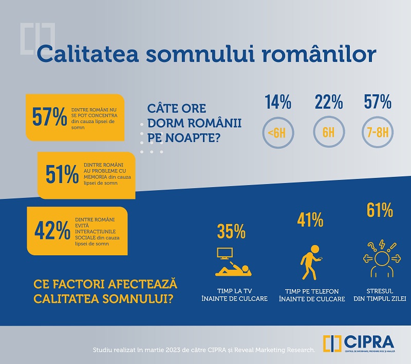 „Tema aleasă pentru Ziua Mondială a Somnului în acest an este Echitatea Somnului pentru Sănătate Globală, ceea ce subliniază importanța somnului indiferent de sex, etnie, statut social, vârstă sau venit, anumite categorii de persoane fiind în mod evident defavorizate și susceptibile de carențe la acest capitol. Lipsa unui somn de calitate are pentru organism efecte la fel de puternice precum lipsa hranei, a apei sau a oricărui alt element vital, afectează de la imunitatea organismului până la modul în care performăm în viața de zi cu zi, personal și profesional. Tocmai din aceste motive, pe site-ul CIPRA avem o secțiune dedicată somnului, unde abordăm împreună cu experții noștri toate aspectele care pot diminua sau, dimpotrivă, îmbunătăți calitatea somnului. Totodată, este esențial ca oamenii să conștientizeze faptul că, atunci când suferă de insomnie sau alte probleme care le afectează dramatic calitatea somnului, pe lângă schimbări ale priorităților și stilului de viață, există specialiști la care pot să apeleze, de la medicul de familie până la psiholog sau chiar somnolog, specializare medicală dedicată tratamentului disfuncțiilor și bolilor somnului“, declară Constantin Bratu, Președinte CIPRA.