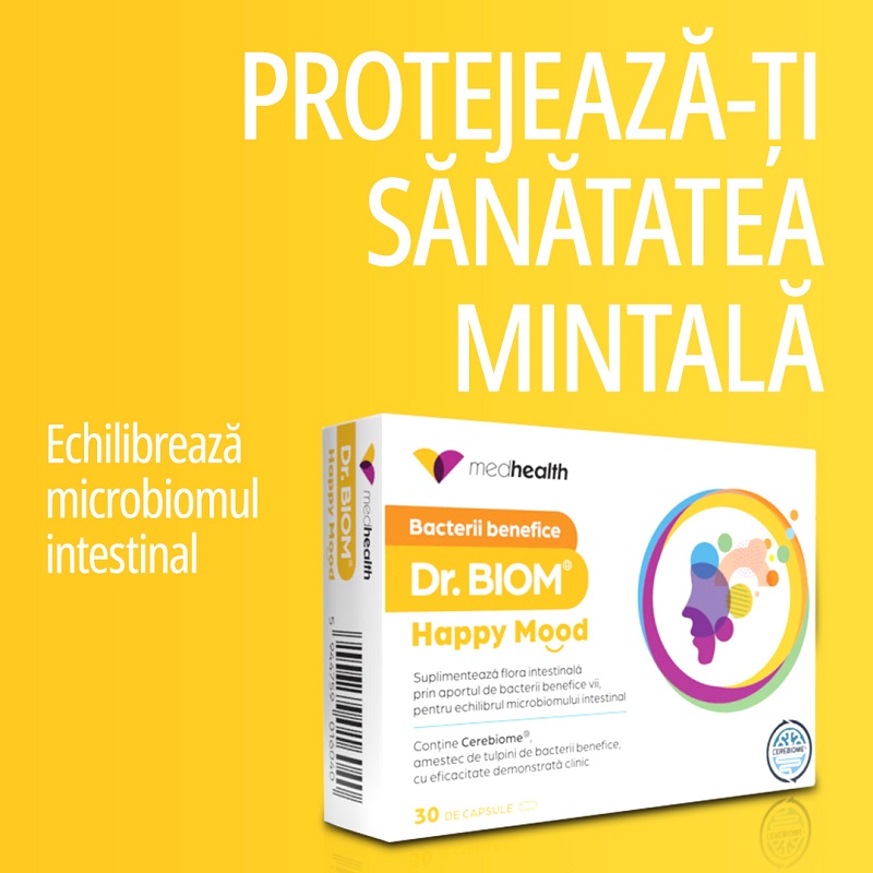 Considerat al doilea creier, intestinul joacă un rol extrem de important pentru sănătate și starea noastră de bine. De aceea, atunci când acesta este copleșit de stres, este bine să-i dăm o mână de ajutor: Dr. BIOM Happy Mood - un psihobiotic ce are la bază complexul Cerebiome – vine să echilibreze atât microbiomul intestinal, dar, totodată, acționează direct și asupra axei creier – intestin – microbiotă.
